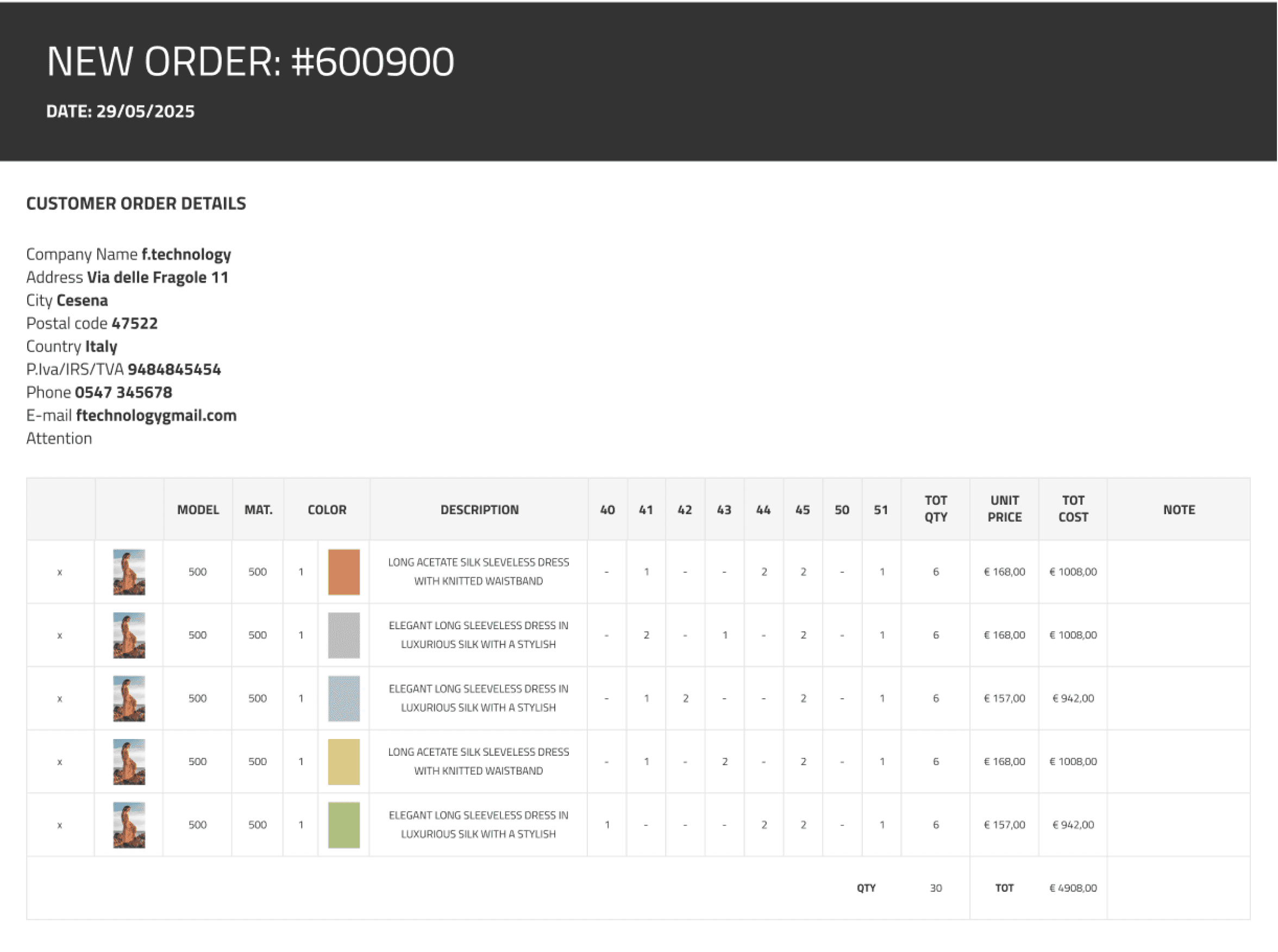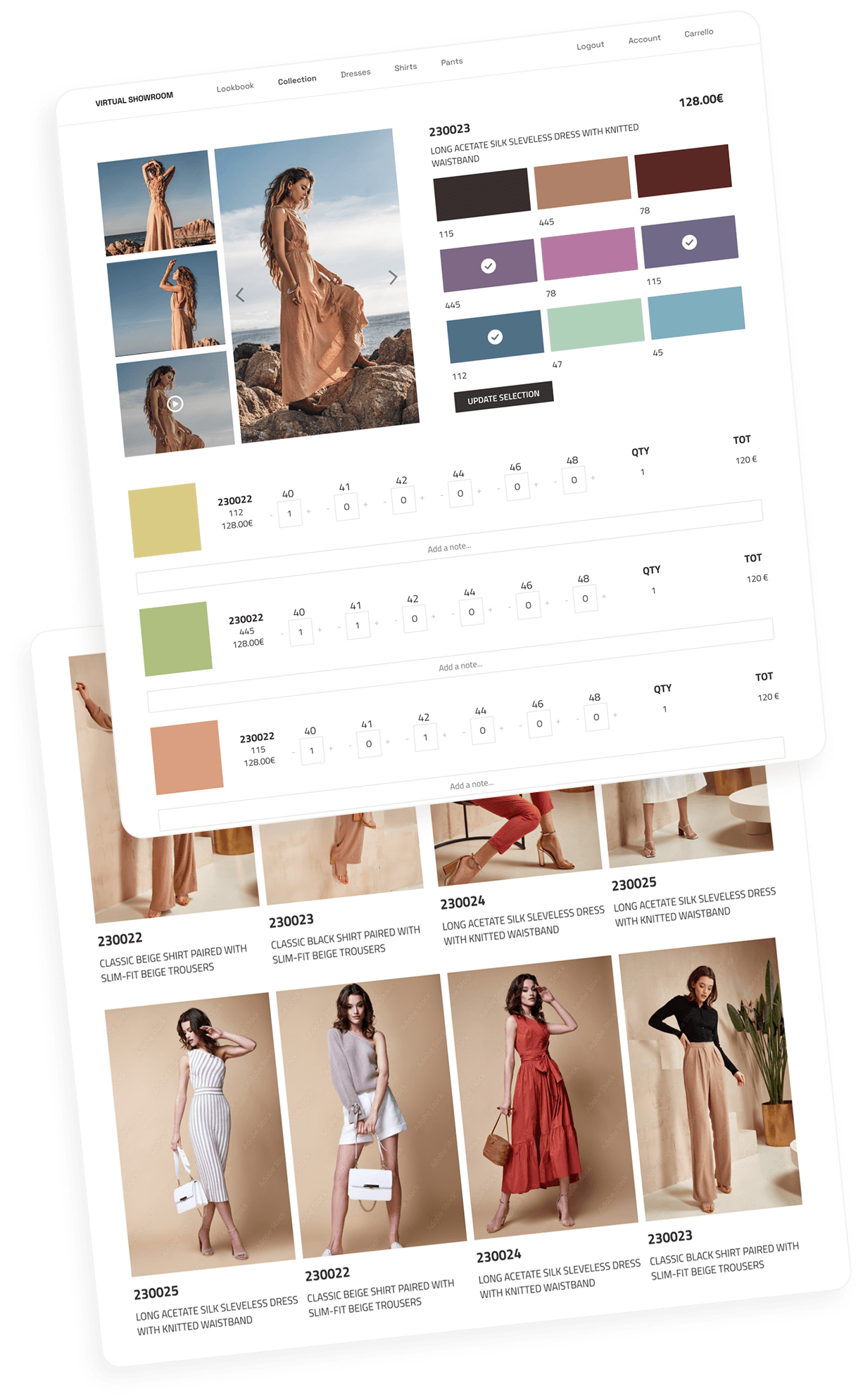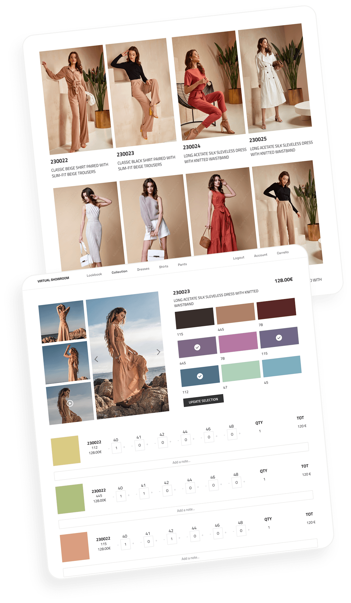 Dal lancio della collezione alla produzione definitiva, la piattaforma accompagna ogni fase con strumenti chiari e intuitivi. I buyer visualizzano il campionario, selezionano i modelli preferiti e inviano gli ordini prima della chiusura delle prenotazioni. I dati raccolti guidano poi la produzione, ottimizzando tempi e quantità.
