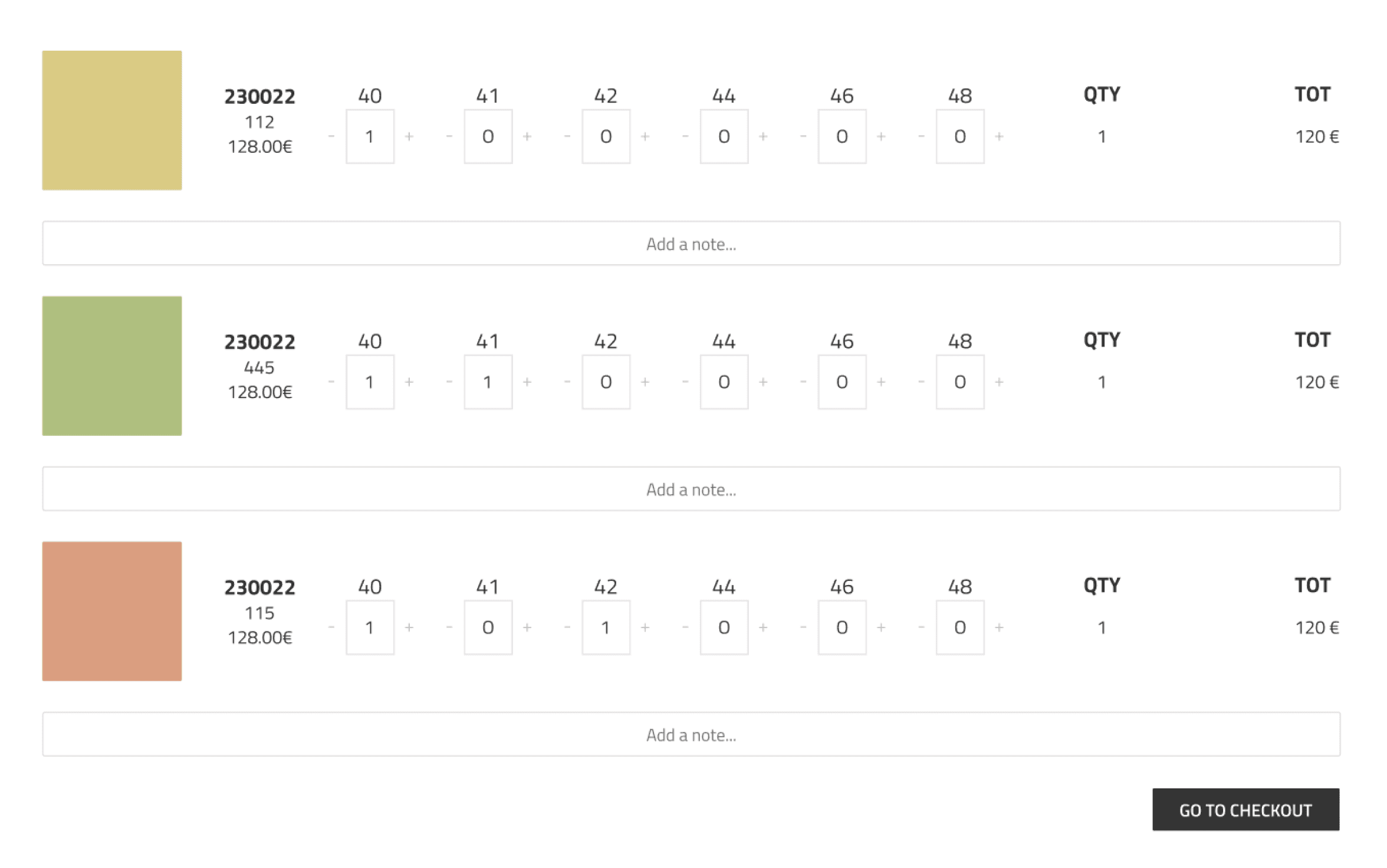 Facilita gli ordini consistenti grazie alla griglia interattiva. I clienti scelgono taglie, colori e quantità in una sola schermata e aggiungono tutto al carrello in un gesto, per un’esperienza rapida e chiara.