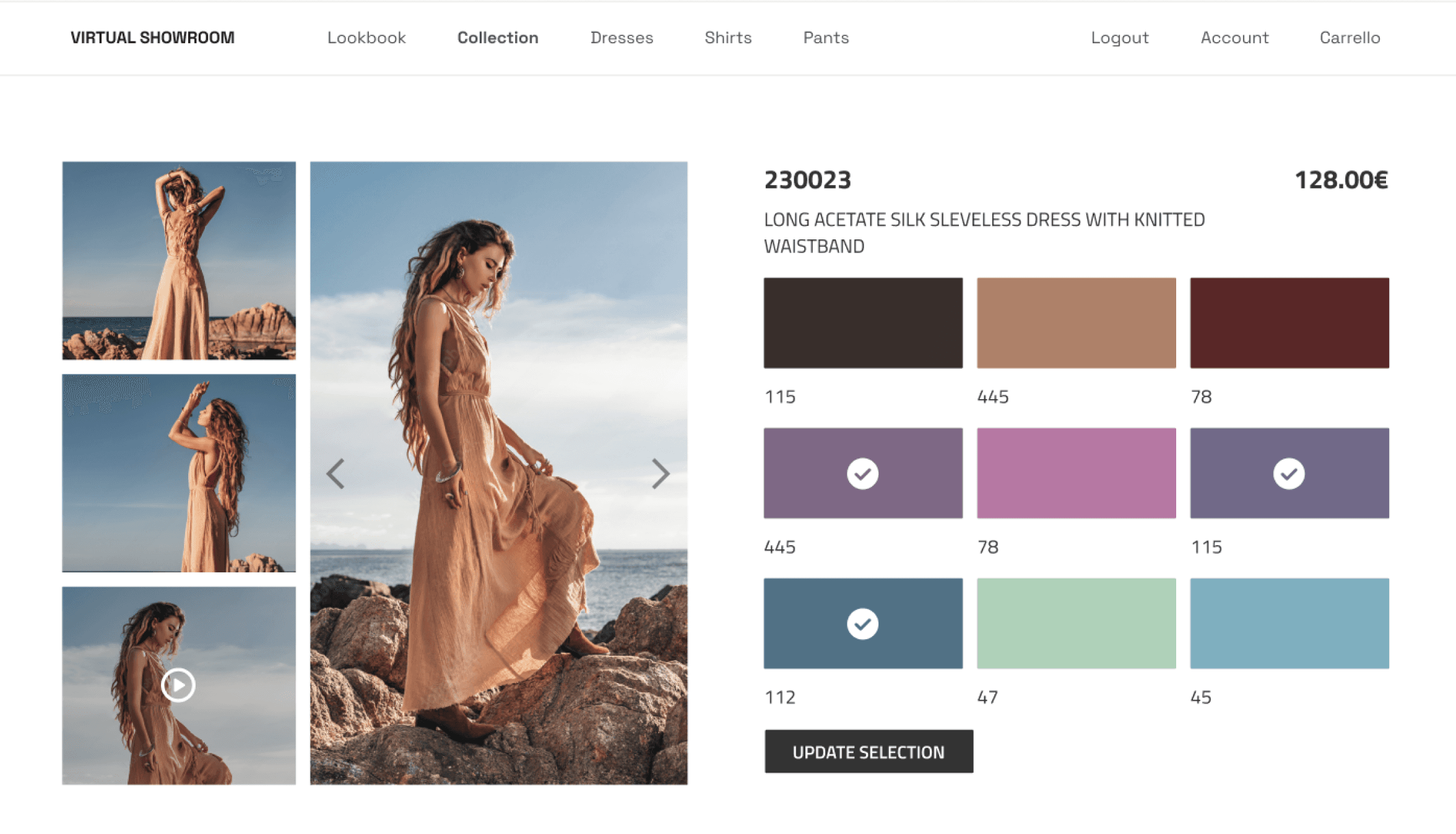 Carica la nuova collezione, completa di lookbook, gallery interattiva e varianti disponibili. I clienti accedono allo showroom virtuale per esplorare i modelli.
